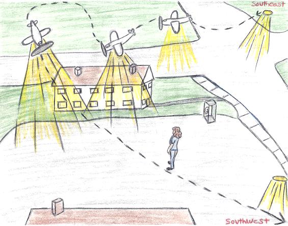 Even though I knew that Kathy's guide, my guide and another team member from the Peace Ship were piloting the vehicle, I still tested them by mentally sending the thought for them to tip the wing towards me and then to turn around and fly back towards me. My thoughts were heard and they carried out my wishes. I remember thinking, "I know this is for Kathy because it's her birthday and she hadn't arrived to see this." The craft then flew over my head and headed Southwest, which is the direction Kathy was driving from. I did not know at the time that they showed themselves to her also as she was driving the country roads to meet me. |